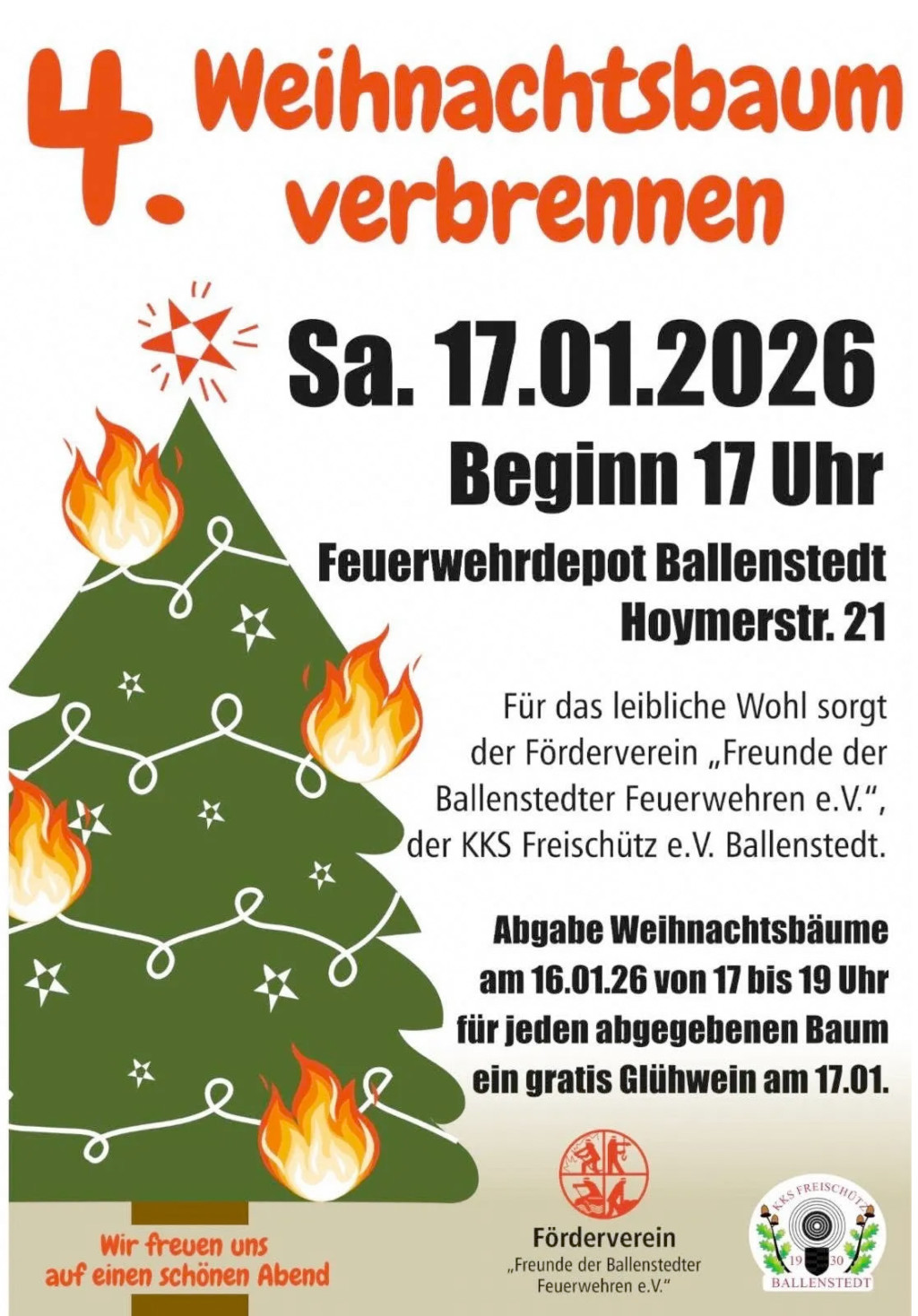Sei dabei, wenn wir die Bäume feierlich verbrennen – Spaß, Wärme und Glühwein inklusive! 🔥💛