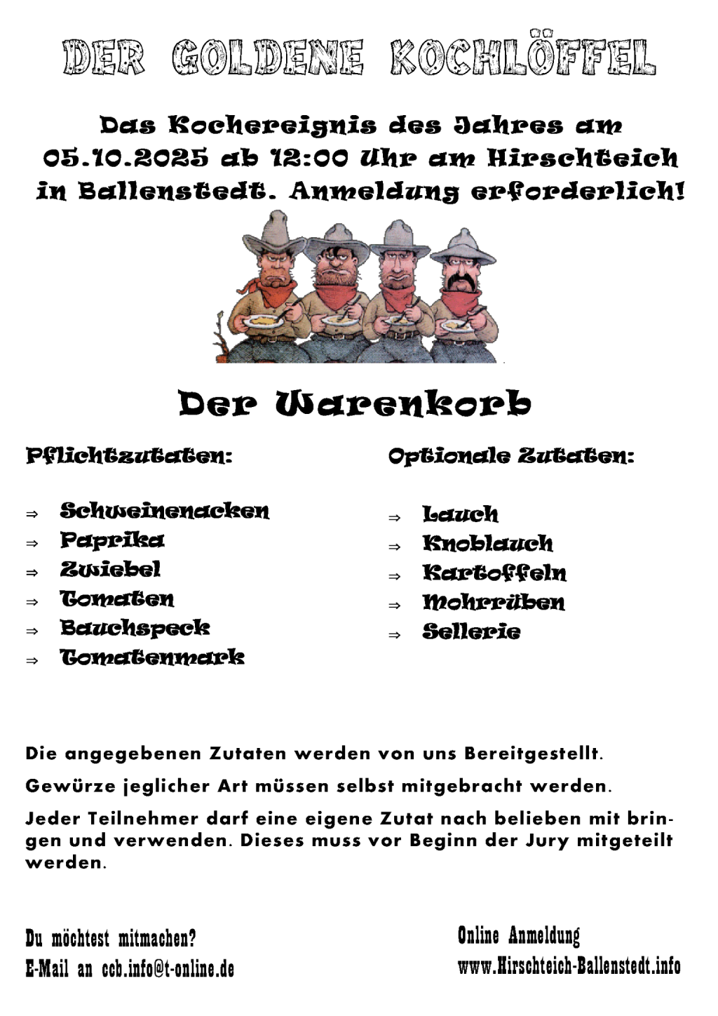 Da die Platzkapazität für die Feuerstellen/ Kochstellen begrenzt sind ist die Veranstaltung auf eine Teilnehmerzahl begrenzt. Jeder kann sich anmelden, aber nur die ersten 10 können auch Starten. Wir geben die Teilnehmer bekannt und informieren, wer dieses Jahr leider nicht starten kann.